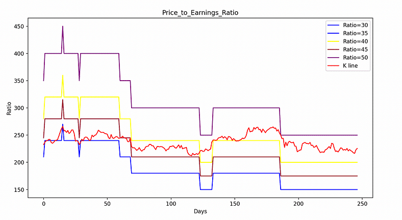 To calculate the price-to-earnings ratio, use the daily closing stock price to divide the quarterly earnings per share to get the current day’s price-to-earnings ratio. In the previous section, the tejapi.get() function was used to obtain financial-related data (df). In this section, the plot function in matplotlib.pyplot was used to draw the price-earnings ratio river graph, and further empirical analysis was carried out. The following are the operation steps: