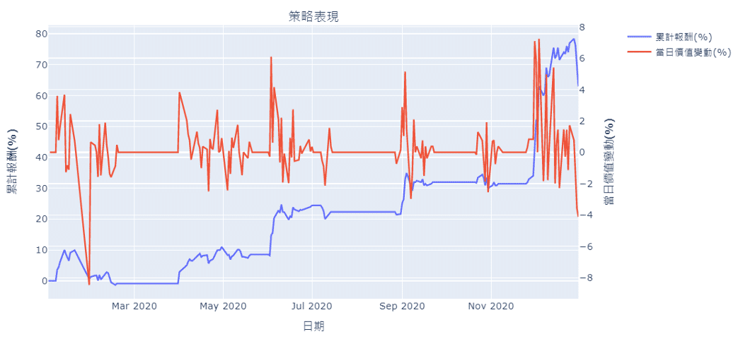 As we can see in the picture, the daily total asset value changes within 8%. If there’s no change, it means the stock price remains the same or we only hold cash. The cumulative return is around 63% at the end, better than the 2020 Taiwan stock market performance.