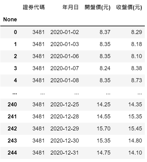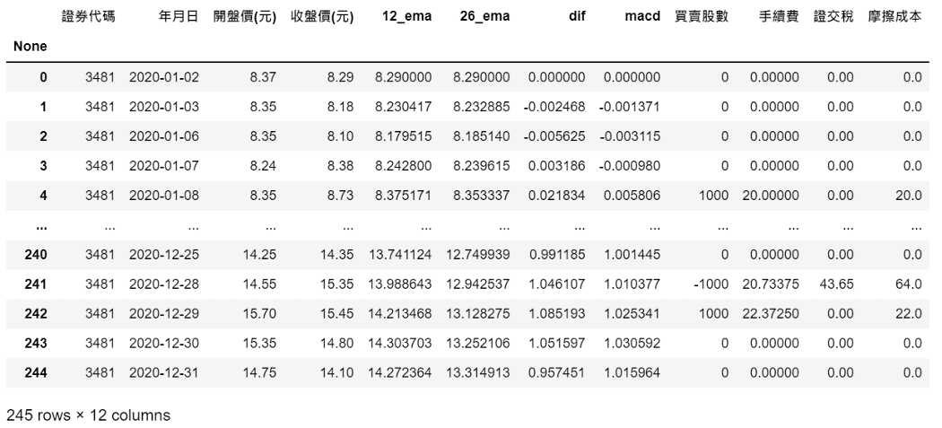 We choose Innolux Corporation (3481) as an example and the columns include opening price, which is used to calculate buying and selling price, and closing price that will produce buy and sell signal.