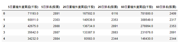 buy_table[str(i)+'日累積外資買超(千股)'] = x.loc[len(x)-1].sort_values(ascending=False)[:5].reset_index(drop=True)
