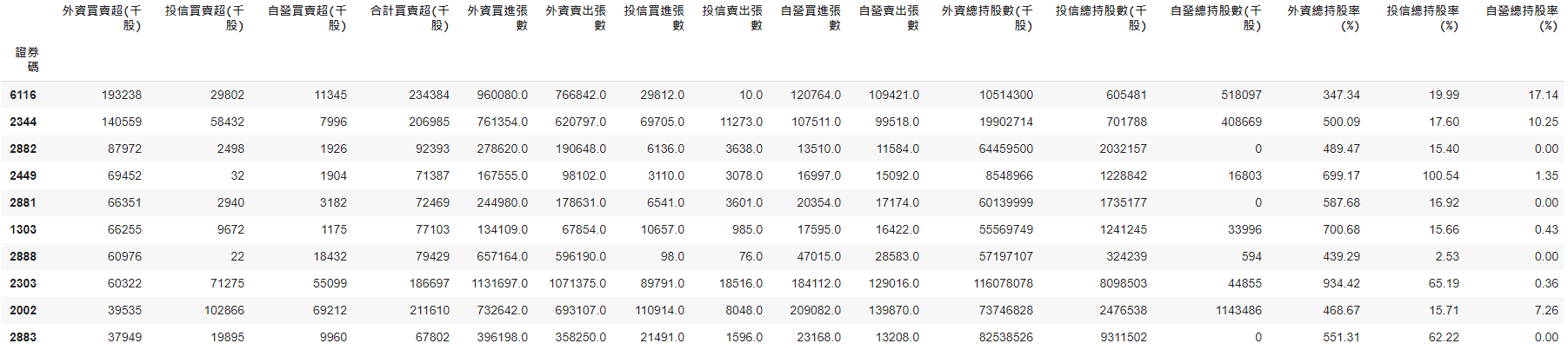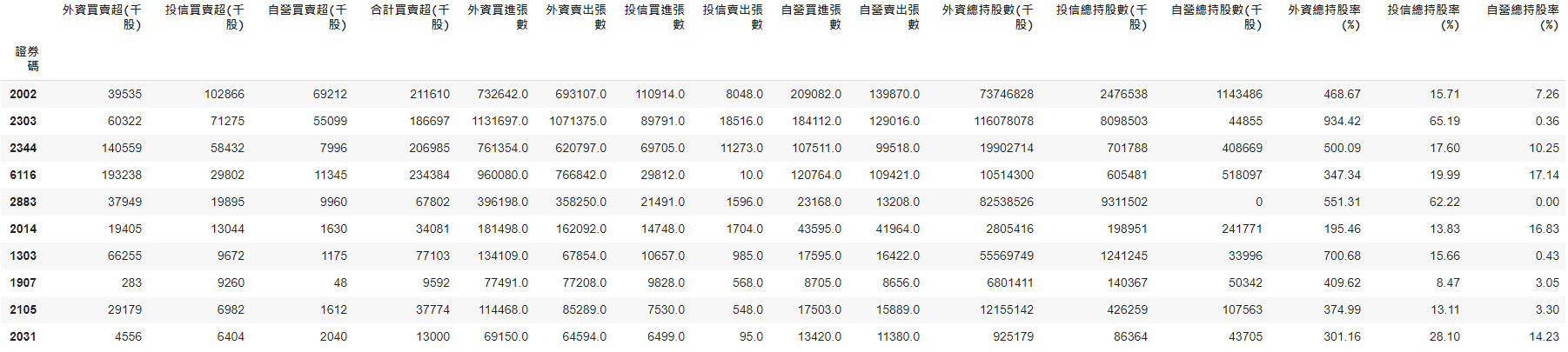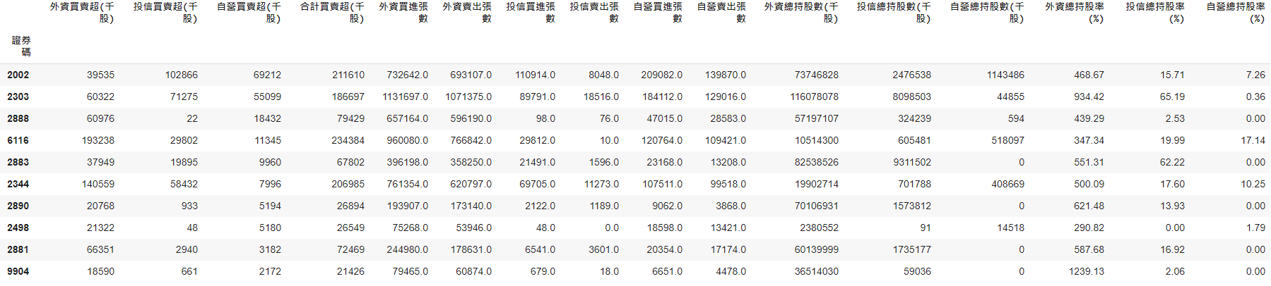 sorted_fi[(sorted_fi['外資買賣超(千股)']>0)&(sorted_fi['投信買賣超(千股)']>0)&(sorted_fi['自營買賣超(千股)']>0)][:10]