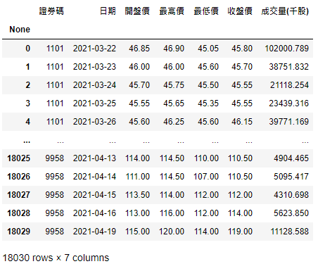 ,chinese_column_name = True)code = stk['證券碼'][(stk['證券種類名稱']=='普通股')&(stk['上市別']=='TSE')].to_list()