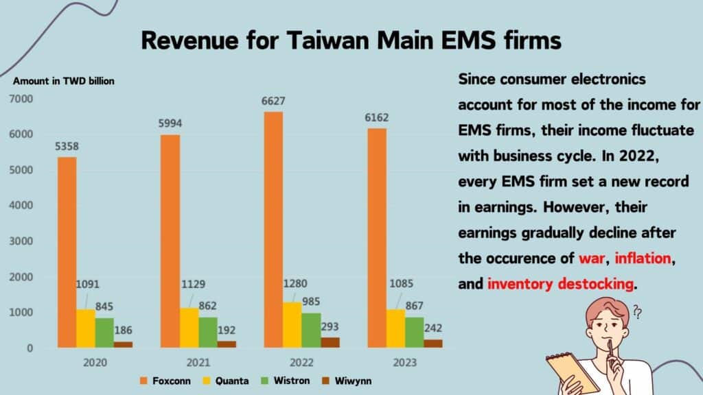 At present, EMS firms primarily focus on 3C electronics products. To mitigate economic fluctuations and enhance growth momentum, many companies have diversified their business into non-consumer electronic products. Among these expansions, entering the server assembly market has been particularly popular. This trend is driven by the intricate safety regulations and certification procedures required for automotive and medical equipment, making entry barriers higher for these sectors. As a result, joining the server supply chain becomes comparatively easier. The chart below illustrates the revenue changes for major Taiwanese manufacturers with Level 12 production capabilities.