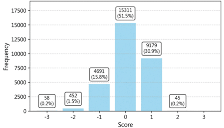Figure 3 shows the distribution of event intensities. Neutral events (score = 0) and mildly positive events (+1) dominate the sample, accounting for 51.5% and 30.9%, respectively. Events with a score of –1 represent 15.8%. Severe negative events (–2, –3) and strongly positive events (+2 or above) together account for only about 2% of observations.