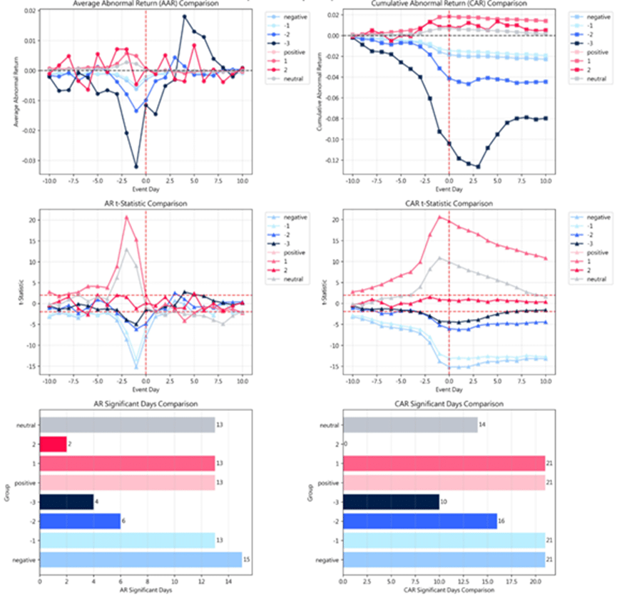 Empirical results indicate that news events exhibit clear directional effects. The final CAAR (at t+10) for negative events increases monotonically with event intensity: –1, –2, and –3 groups show final CAARs of –1.89%, –4.43%, and –7.97%, respectively. Although statistical significance for the –3 group is weaker due to limited sample size, the economic magnitude remains substantial.