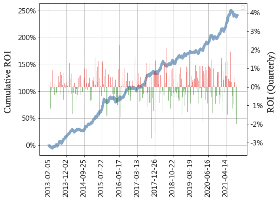 By analyzing the trend of the four net worth curves, the results show that the blue line considers the real-time data and survivor deviation factors. The net worth curve trend is closest to the actual results, and the overall performance is better than the medium 100 index; however, the green line is due to the existence of survivor bias. Overestimate the performance of the portfolio; the light blue line underestimates the performance of the portfolio due to lagging assumptions. It can be seen that Point-in-Time data and survivorship bias will have a great impact on the results of quantitative analysis. Therefore, the subsequent research and analysis of this article will use TEJ API to obtain Point-in-time data on the monthly revenue announcement date. In addition, the data of index constituent stocks are also captured to solve the problem of survivor bias.