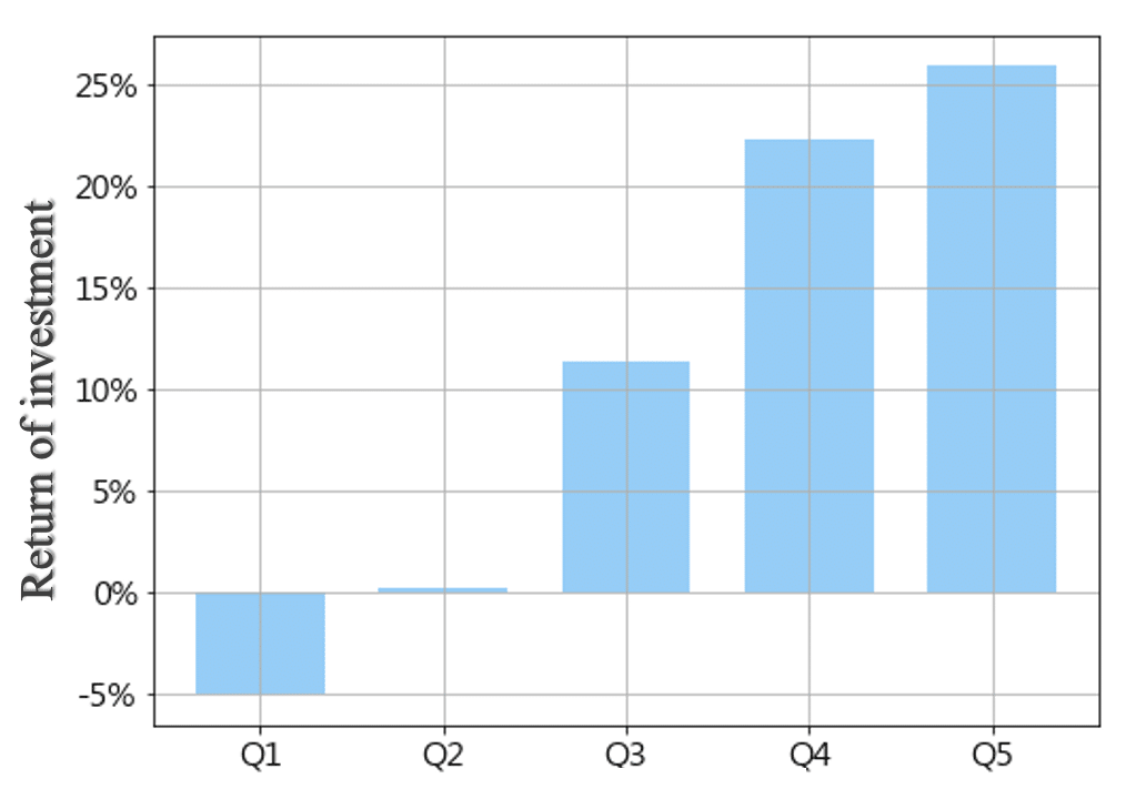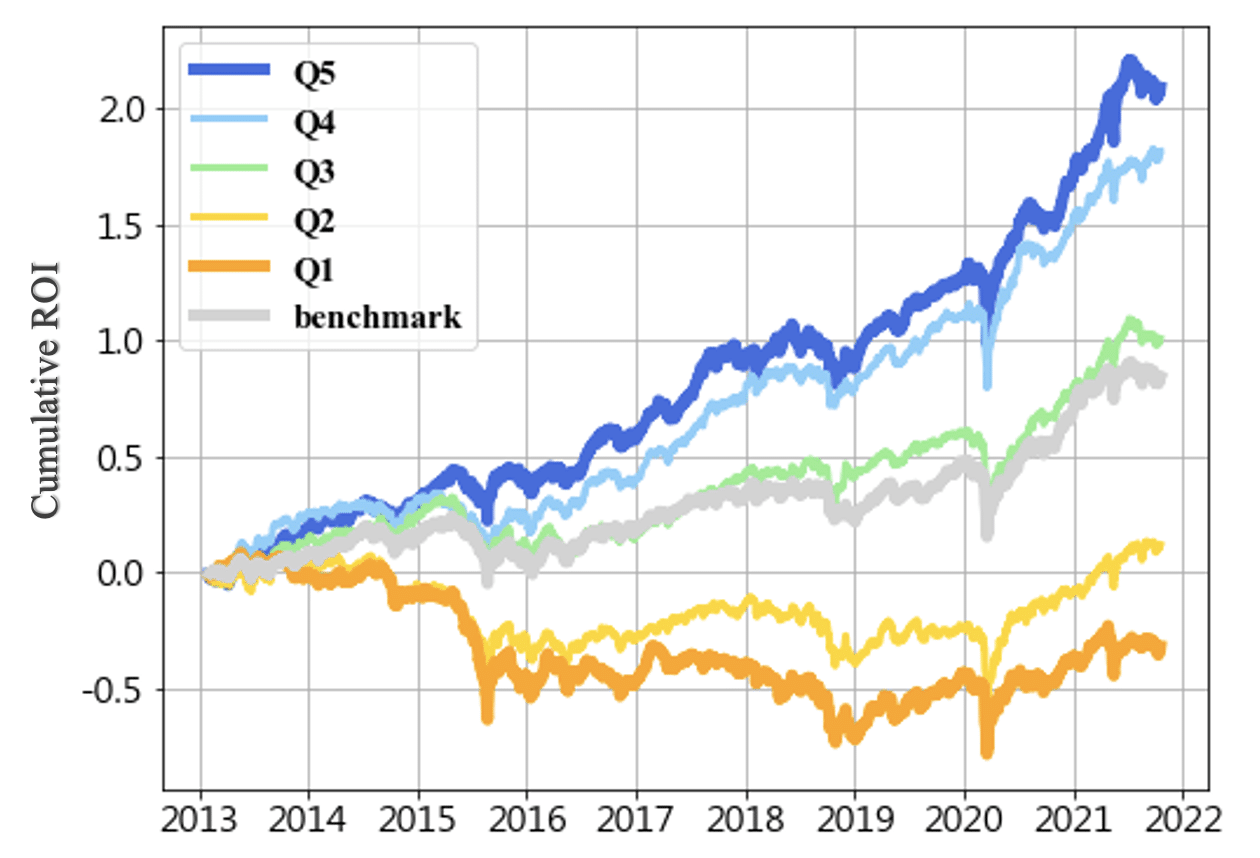 The data in the following figure is taken from TEJ API. The obtained data includes the announcement date of the company’s monthly revenue and the complete stock pool sample including the latest and past. The data period is from 2013 to 2021, using the mid-cap 100 index constituent stocks as a sample, and the analysis results are as follows. Figure 4.1 shows that the annualized rate of return of the investment portfolio constructed by using the monthly revenue growth rate information is higher with the higher the group (that is, the group with the higher the monthly revenue growth rate). In addition, as shown in Figure 4.2, the cumulative returns of the Q4 and Q5 portfolios are stable and better than the mid-cap 100 index. On the contrary, the cumulative returns of the Q1 and Q2 portfolios are both stable and worse than the mid-cap 100 index. Finally, looking at Figure 4.3, the net value curve of the long-short hedged portfolio is not affected by the fluctuation of the market momentum and obtains a stable alpha return.