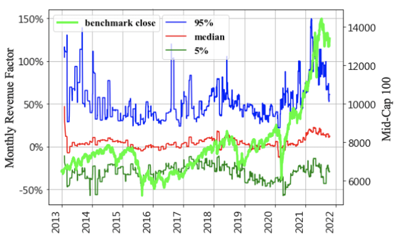 The data in Figure 3.1 below is taken from TEJ API. Taking the constituent stocks of the mid-cap 100 index from 2013 to 2021 as a sample, the time series chart of the monthly revenue growth rate of top95%, median50%, and bottom5% is drawn. Among them, the average annual growth rate of monthly revenue of top95% is more than 30%, median50% is more than 0%, and bottom5% is between -50%-0%. On the whole, the trend of the mid-cap 100 stock price index and the annual growth rate of monthly revenue is roughly the same. In the decline period of the index from 2014 to mid-2015, 2018 to 2019, and the rising period of the index from 2016 to 2018, and March 2020 to 2021, the stock price showed a rise and fall along with the annual growth rate of monthly revenue. . The data shows that the monthly revenue growth rate is positively correlated with the stock price index, and changes in fundamentals affect the future ups and downs of stock prices. Therefore, the next paragraph will further use portfolio analysis to test the information content of monthly revenue.