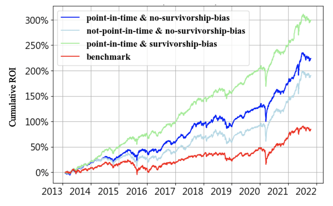 Following figure 2.1 below, it uses the constituent stocks of Taiwan’s mid-cap 100 stock index as a sample and uses the monthly revenue growth rate as a stock selection indicator to construct an investment portfolio. And under the condition of using three different data, different color portfolio net worth curves are generated respectively. The green line is based on the latest index constituent stocks as a sample. After obtaining monthly revenue data in real-time, the investment portfolio is formed by stock selection, that is, using Point-in-Time data, but with survivor bias. The light blue line is a sample of the latest and past index constituent stocks, but it is assumed that the monthly revenue information is announced on the 10th of each month and the stock selection is formed after the stock selection, that is, no Point-in-Time data is used, but there is Avoid survivors’ deviations. The blue line not only uses the latest and past index stocks as samples but also adjusts the investment portfolio in a timely manner when obtaining the latest monthly revenue information, that is, using Point-in-Time data to avoid survivor bias factors. The red line is the net value curve of the mid-cap 100 index.