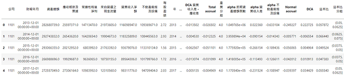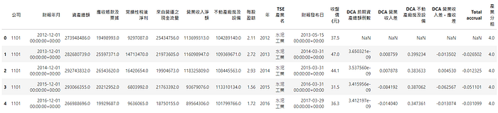 # 計算 DCA data['Total accrual'] = (data['常續性稅後淨利'] - data['來自營運之現金流量']) * data['DCA 前期資產總額倒數'] # Ydata['DCA 前期資產總額倒數'] = 1 / data.groupby('公司')['資產總額'].shift(1) # X0