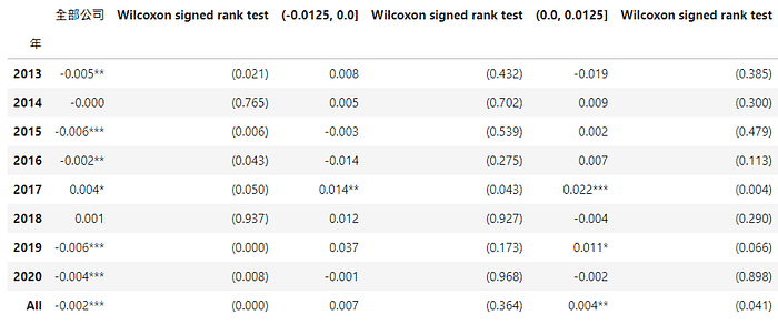 p-values of the Wilcoxon signed rank test <= 0.01,則係數新增***