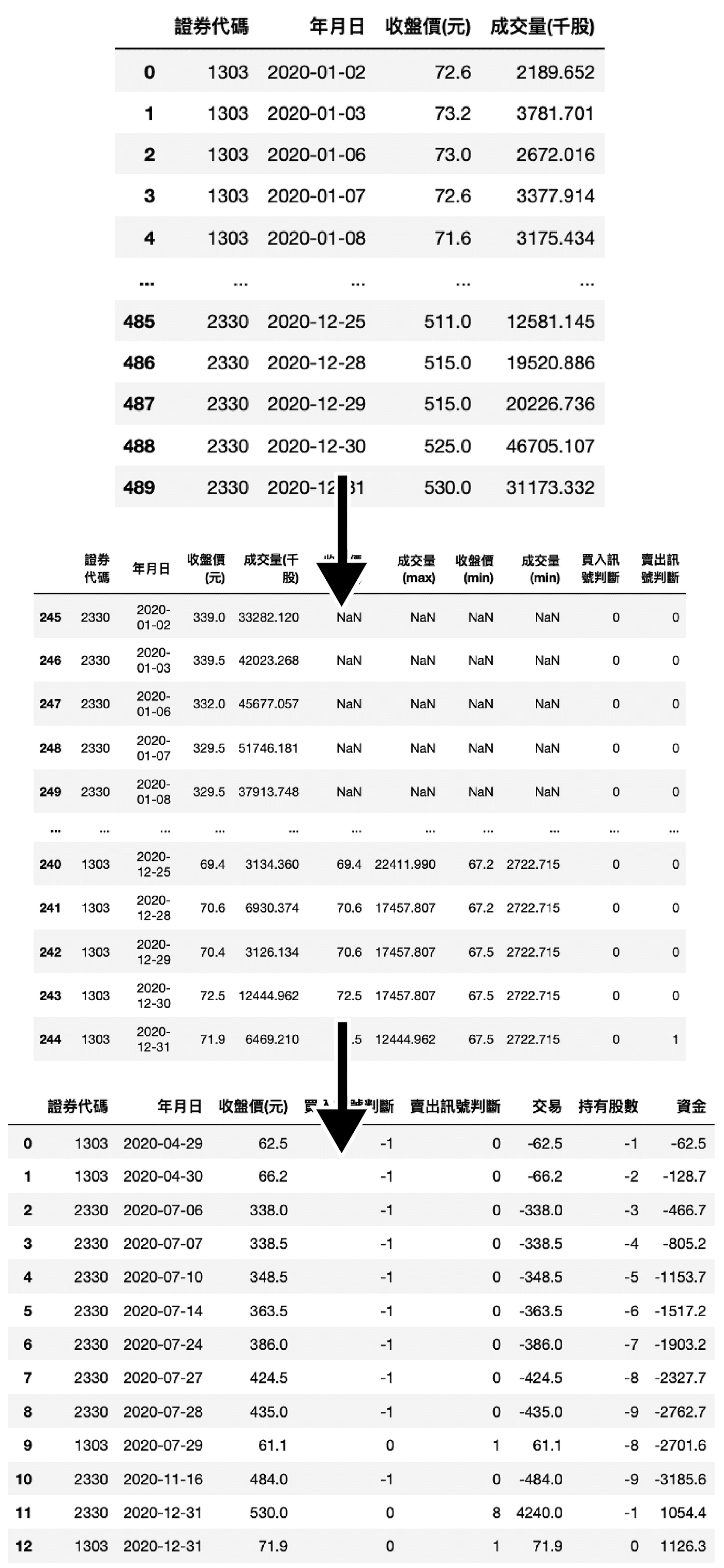 rolling_max = target_data[['收盤價(元)', '成交量(千股)']].rolling(20).max()rolling_min = target_data[['收盤價(元)', '成交量(千股)']].rolling(10).min()