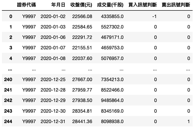 stock_data['買入訊號判斷'] = np.where((stock_data['收盤價(元)'] == stock_data['收盤價(max)']) & (stock_data['成交量(千股)'] == stock_data['成交量(max)']), -1, 0)