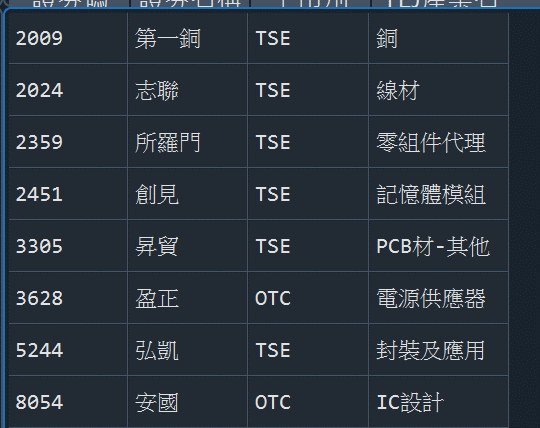 opts={'columns': ['coid','stk_name','mkt','tejindnm',]}