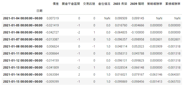 Spread_2021_01_03['倉位情況'] = Spread_2021_01_03['倉位情況'].shift() # 隔天開盤才進場Spread_2021_01_03 = Spread_2021_01_03.join(stock)