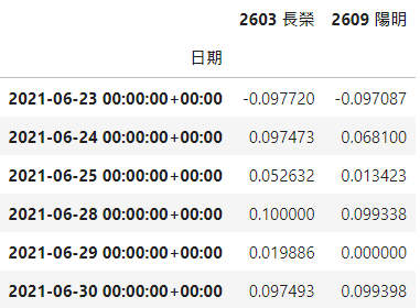 chinese_column_name=True,paginate=True)stock = stock.pivot(index='日期', columns='證券碼', values='日報酬率(%)')