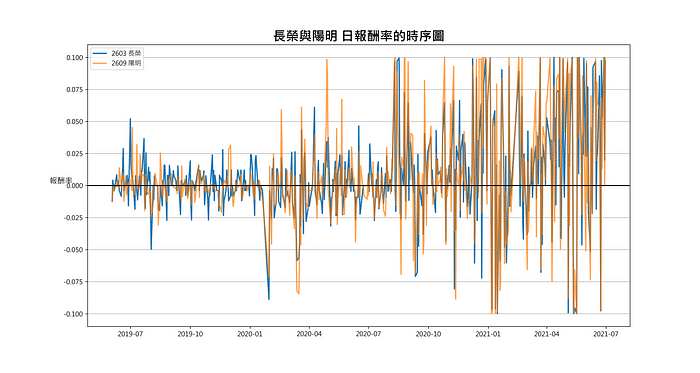 # 長榮與陽明 日報酬率的時序圖