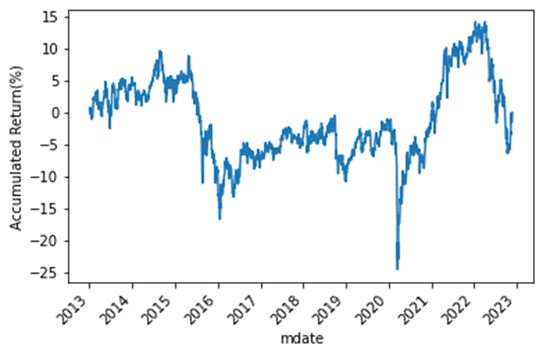The provided backtesting method for the portfolio constructed using PCA shows that its performance is not favorable. This outcome was somewhat expected since PCA is primarily used for portfolio classification based on return correlations and does not guarantee good returns on its own.
