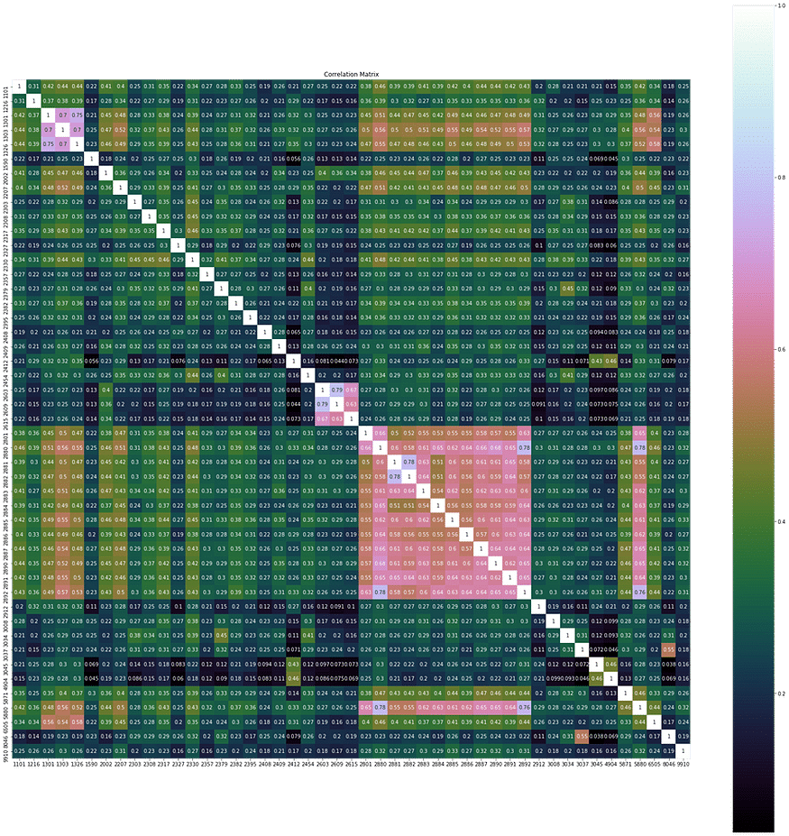 First, we need to have a basic understanding of the dataset. By observing the correlations between the returns of each constituent stock, we can see a significant positive correlation among daily returns. Therefore, the data can be represented in a lower dimension, which is less than the current 47 dimensions.