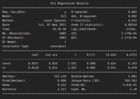 The summary report shows that the T statistics is greater than 2, so yesterday’s return(x1) has a significant effect on today’s return, so we should include x1 into our model.