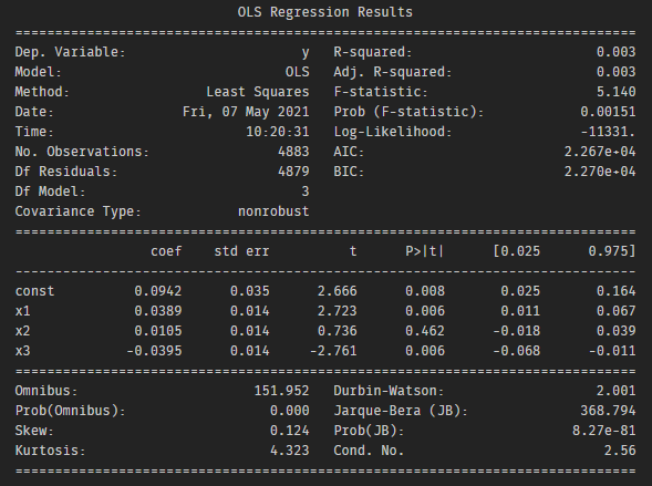We think the information contains in x1 is not enough for us to well predicted the future return. Therefore, we adjust our model, consider more lag into the model. Finally, we take lag 2, 3-period return into account.