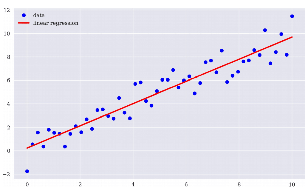 We can find the best line to fit the data according to the formula above. The score measures by the average distance among points to the straight, called mean square error. The linear regression aims to find the best combination of the coefficients (β0, β1) that minimize the mean square error.