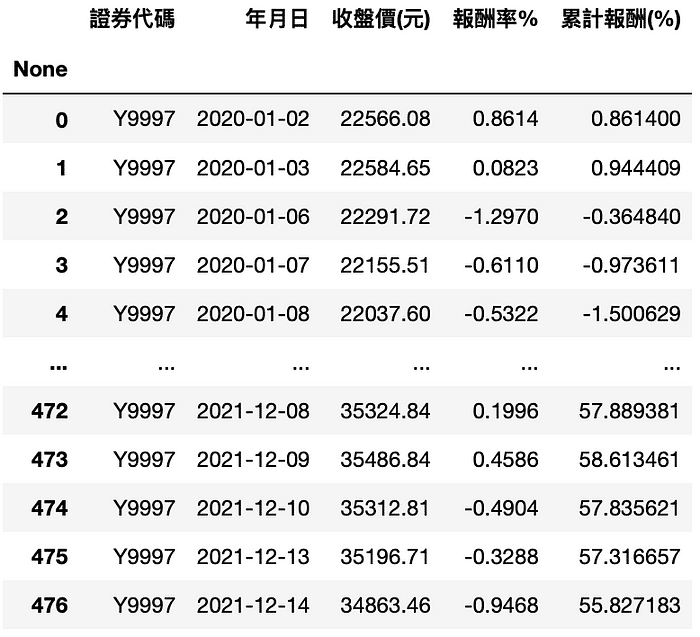 chinese_column_name = True)market['累計報酬(%)'] = (market['報酬率%'].apply(lambda x:0.01*x +1).cumprod() - 1)*100