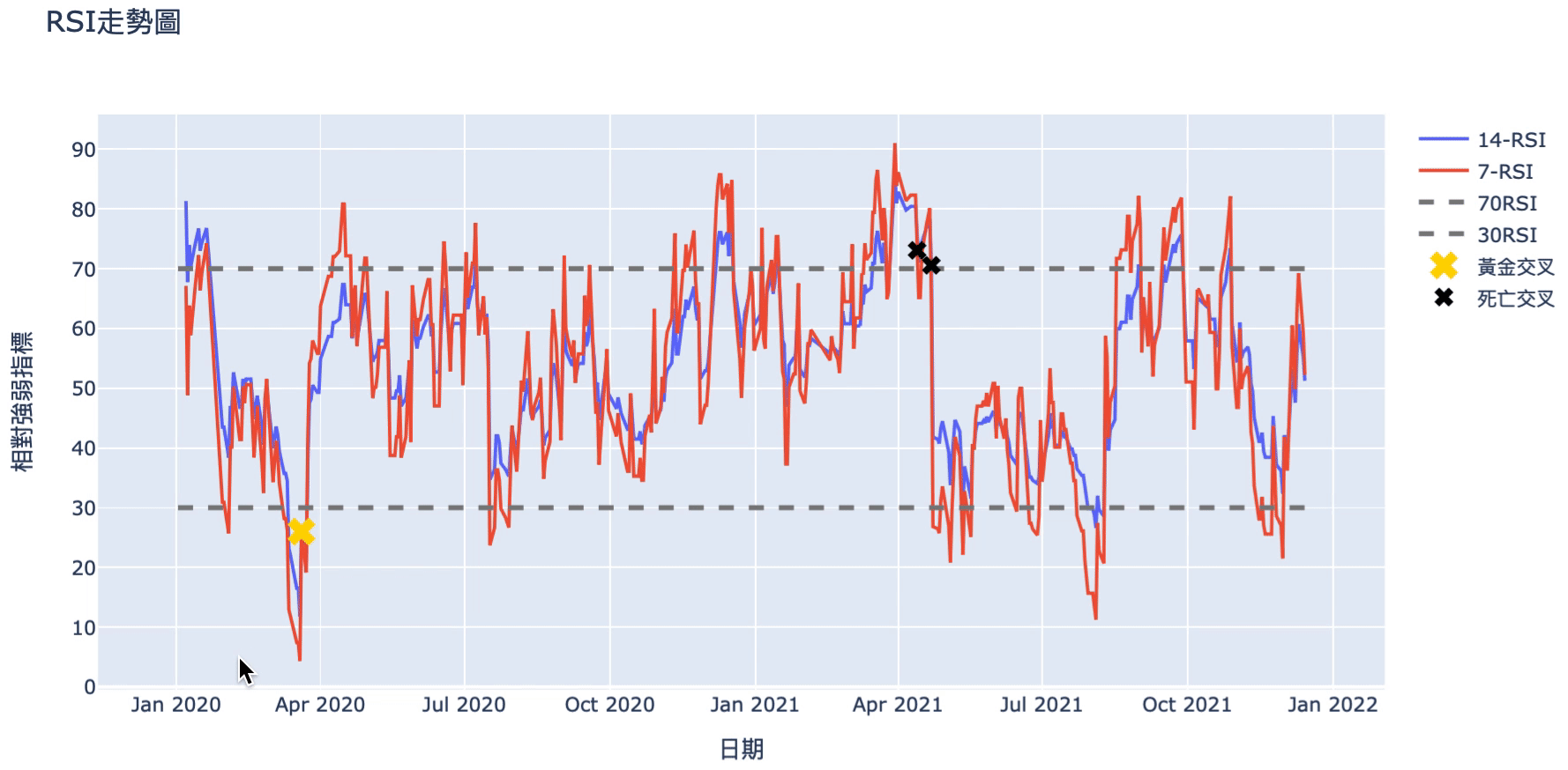 if stock_data.loc[i, '14日相對強弱指標'] <= 30 and stock_data.loc[i-1, '14日相對強弱指標'] > stock_data.loc[i-1, '7日相對強弱指標'] and stock_data.loc[i, '14日相對強弱指標'] <= stock_data.loc[i, '7日相對強弱指標'] and trade == 0: signal.append(1000)
