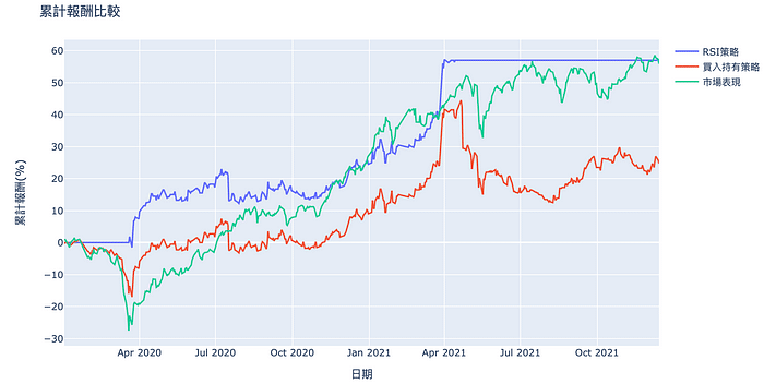 Besides, to demonstrate whether RSI strategy performs relatively well, we add buy-and-hold strategy and market performance as our benchmarks.