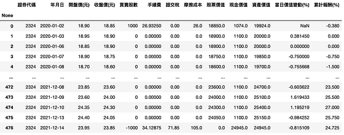 bh_data.loc[len(bh_data)-1, '買賣股數'] = -1000# Drop the columns useless for buy-and-hold calculation.