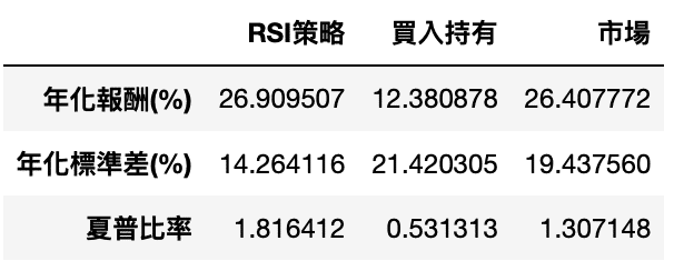 Above chart shows that RSI strategy outperforms buy-and-hold on both return and volatility, which means that RSI helps us find adequate long and short point and improve the efficiency of investment. As for the comparison with market, return of RSI does not outperform market return significantly, but the volatility of RSI is relatively stable. Resulting from avoiding pandemic crash in 2020 and local crash in Taiwan in 2021, sharpe ratio of RSI is better than market performance.
