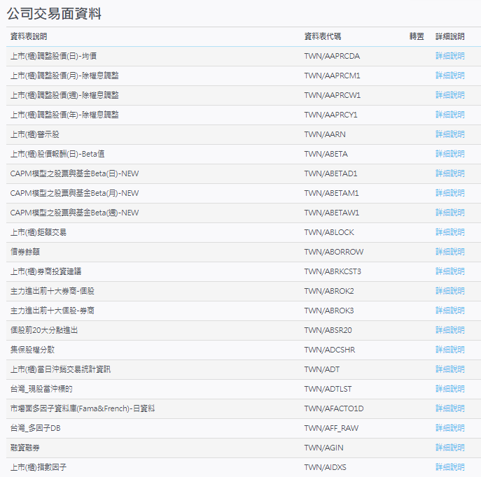 You can search the code through TEJ API official website> database list in the upper right corner> query by region> Taiwan Database to find the database we want to use (TWN/APRCD). The database web interface is as follows: