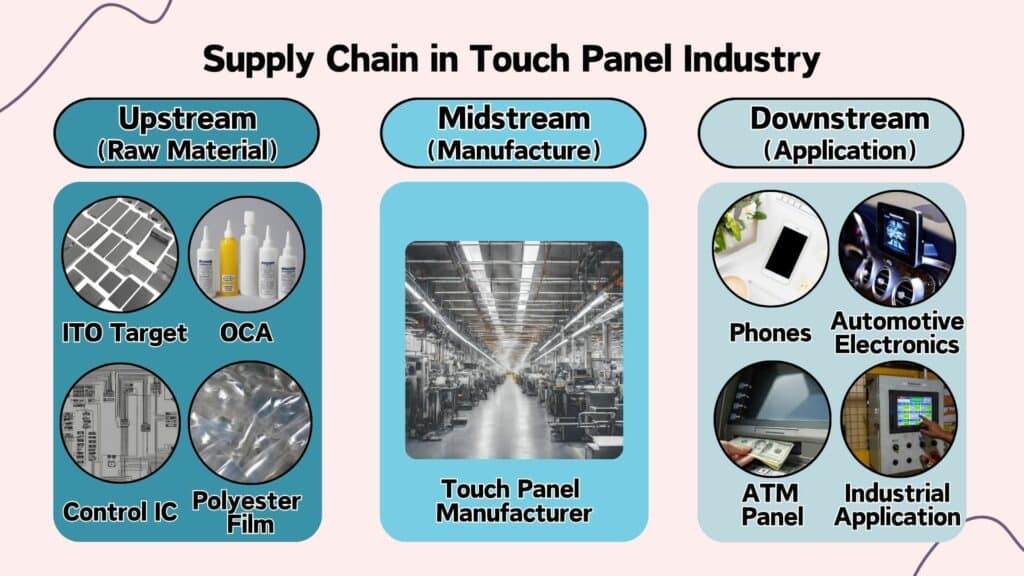 According to the Industry Chain Information Platform of TWSE, the supply chain for the touch panel industry can be divided into upstream, midstream, and downstream segments: