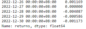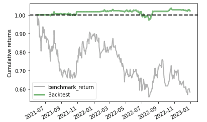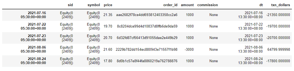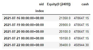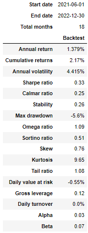 Via run_algorithm(), we can execute the strategy we built above. The backtesting time period is set between 2021-06-01 to 2022-12-31. We assume the initial capital base is 500,000. The output of run_algorithm(), which is results, contains information on daily performance and trading receipts.