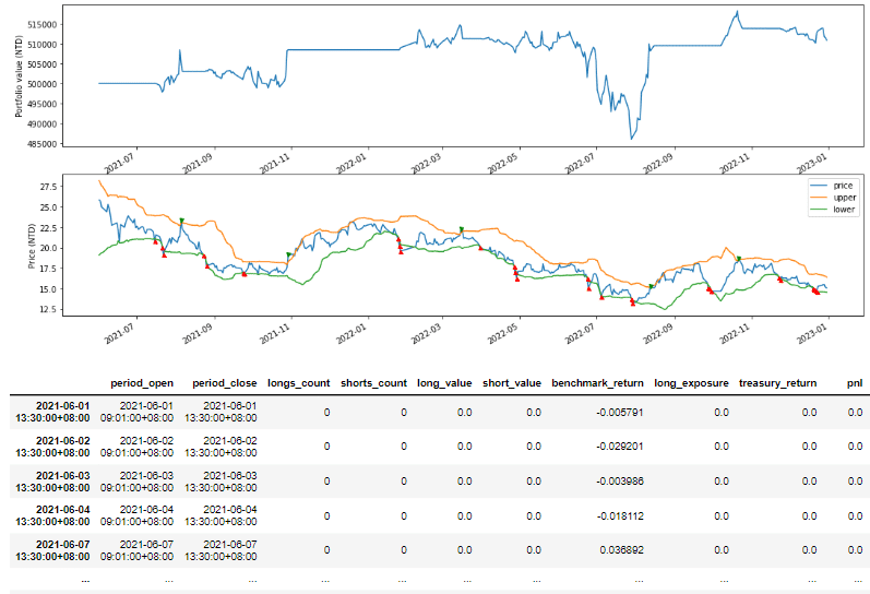 The same issue has happened in the continuously lower trend. A sharp lower trend occurred from 2022-04, which led to consistently touching the lower bound. That means we have bought a bunch of stocks in this time zone. However, after the price recovered shortly, the close price touched the upper bound immediately. As a result, we sell the holding positions and earn a net loss during this time period.