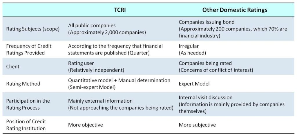 Based on the market’s emphasis on corporate credit risk assessment, TEJ’s industrial research team developed the “TCRI Taiwan Corporate Credit Risk Index” (hereinafter referred to as TCRI) in 1991, which is an open, transparent and highly differentiated credit rating system based on a quantitative model and supplemented by professional manual interpretation. TCRI is widely recognized by most financial institutions for its high differentiation ability, stability of volatility, and comparability with large international credit rating agencies. Currently, the TCRI has become an important reference index for over 90% of Taiwan’s banking industry to measure credit risk in investment and lending.