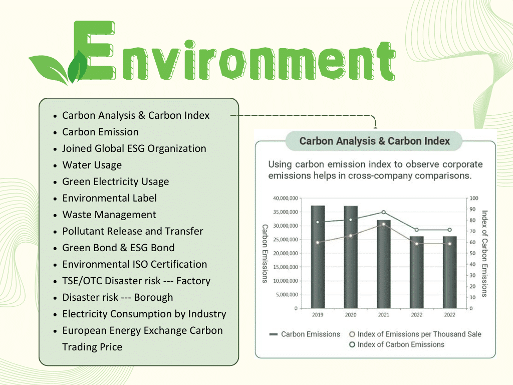 • Visual Dashboards: In addition to statistical raw data, TEJ develops visual dashboards. These graphical presentations make it easy to compare and evaluate companies’ ESG performance.