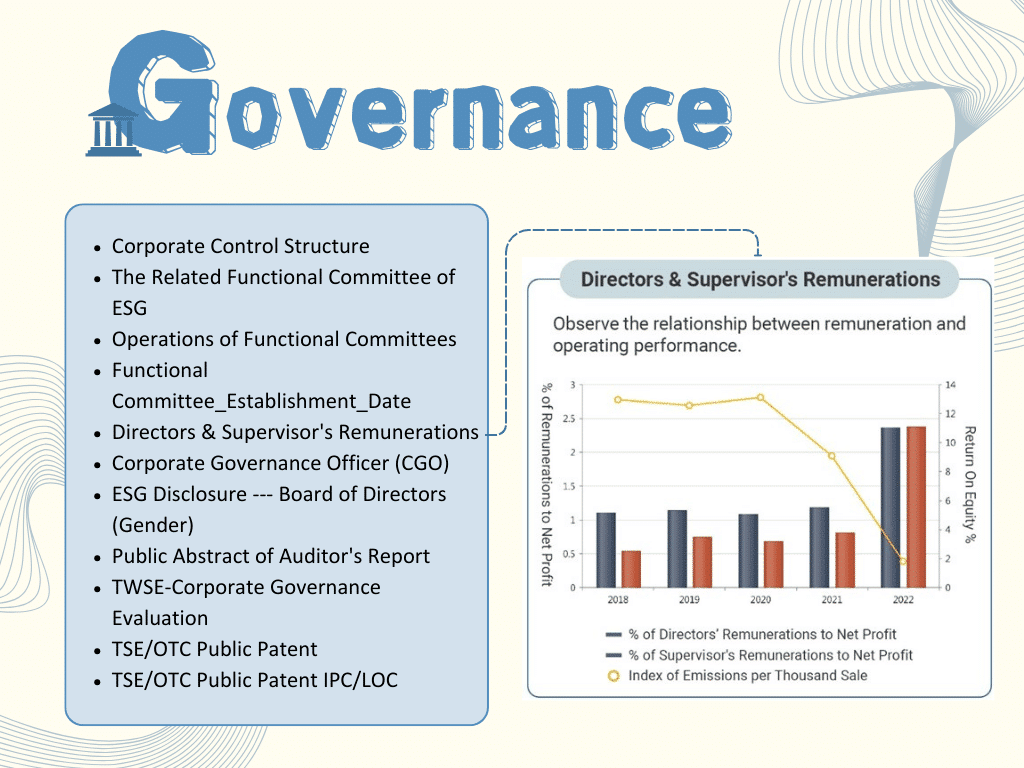 • Governance: Includes data on director and supervisor compensation, board gender composition, patent statistics and details, and other related information.