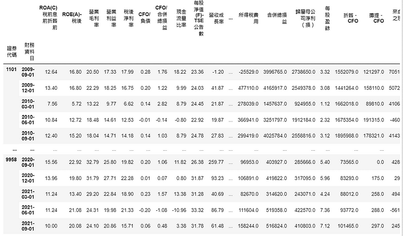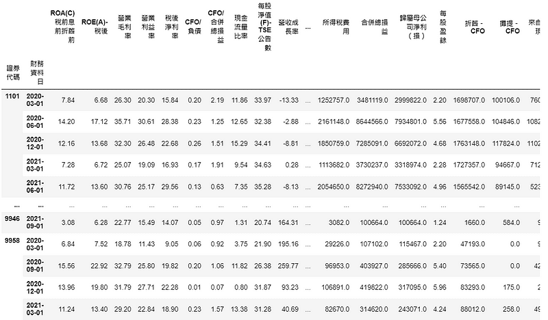 合併所有的資料,將證券代碼、財務資料日作為新的索引,且只選擇數值資料的欄位
