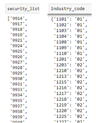 security = tejapi.get('TWN/ANPRCSTD',mkt = 'TSE',stypenm = '普通股',paginate = True,chinese_column_name = True)#儲存公司代碼security_list = security['證券碼'].tolist()#儲存產業代碼industry_code = security[['證券碼', 'TSE業別']]industry_code = industry_code.set_index('證券碼').to_dict()['TSE業別']