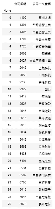 this_season = fin_data[fin_data['財務資料日'] == '2021-09-01']this_season['產業'] = this_season['證券碼'].map(industry_code)this_season = this_season.set_index(['證券碼', '財務資料日', '產業']).loc[:,positive_features]score = this_season.groupby(['產業']).rank(pct=True).sum(axis = 1)rank = score.rank(pct = True)firm_list = [i[0] for i in rank[rank > 0.97].index]firms = tejapi.get('TWN/AIND',coid = firm_list,opts = {'columns':['coid','fnamec']},paginate = True,chinese_column_name = True)