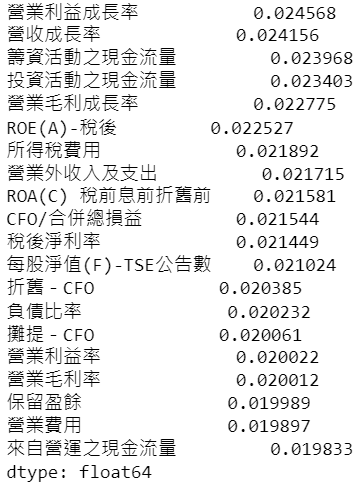print("訓練集分數: " , rf.score(train_data.drop(columns = '季報酬率 %'), train_data['季報酬率 %'] > 0))print("訓練集分數: " , rf.score(test_data.drop(columns = '季報酬率 %'), test_data['季報酬率 %'] > 0))