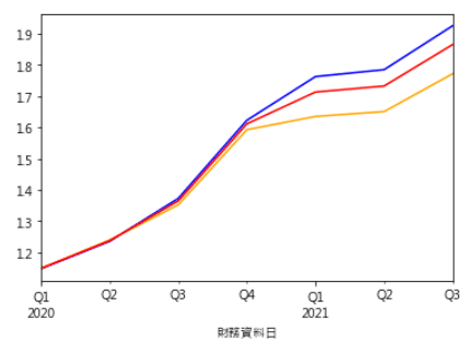 score = merge[positive_features].groupby(['財務資料日', '產業']).rank(pct=True).sum(axis = 1)rank = score.rank(pct = True) #總分再rankfilters = rank > 0.97(merge[filters].groupby('財務資料日').mean()['季報酬率 %']*0.01+1).cumprod().plot(color = 'blue')(merge[~filters].groupby('財務資料日').mean()['季報酬率 %']*0.01+1).cumprod().plot(color = 'orange')(merge.groupby('財務資料日').mean()['季報酬率 %']*0.01 + 1).cumprod().plot(color = 'red')