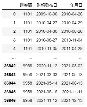date_data = date_data.groupby(['證券碼', '財務公告日']).last().reset_index()date_data = date_data.rename(columns = {'交易日期':'年月日', '財務公告日':'財報發布日'})
