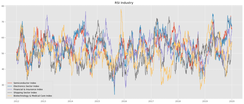 我們可以簡單看出各個產業之間確實會有複雜的輪動關係,產業的 RSI 數值似乎呈現週期的先後關係。但我們無法以肉眼去確認這些輪動關係是否成立或是在統計上是顯著的關係,因此會進行上述提過的統計分析方法來去尋找可靠的產業輪動情形。