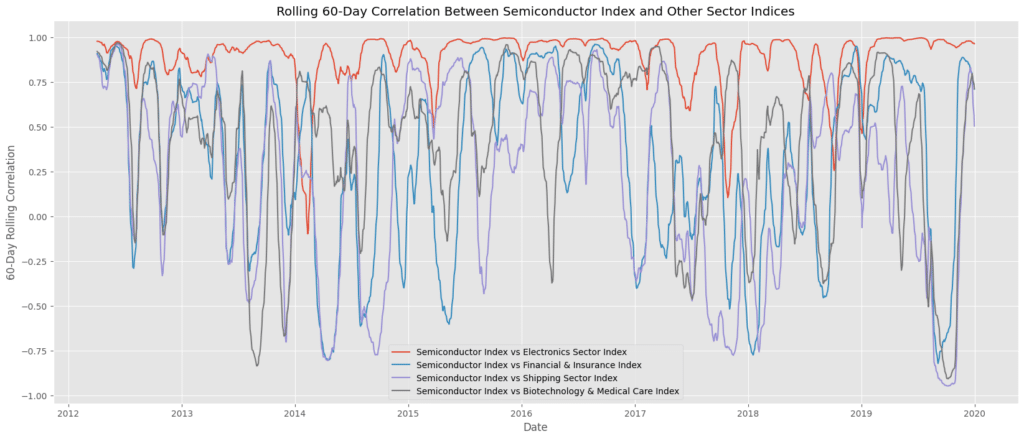 本圖透過 60 日滾動相關係數觀察產業間相對連動性變化。從時間序列來看,電子產業與半導體維持高度同步關係(紅色線),屬於結構性連動。相較之下,航運產業與半導體之間的相關性則呈現週期性波動,顯示兩者之間可能存在具時間延遲性的輪動關係。金融產業、生技產業則展現出更多反向或不穩定的連動特徵,支持其為非同步或防禦性資產的判斷。