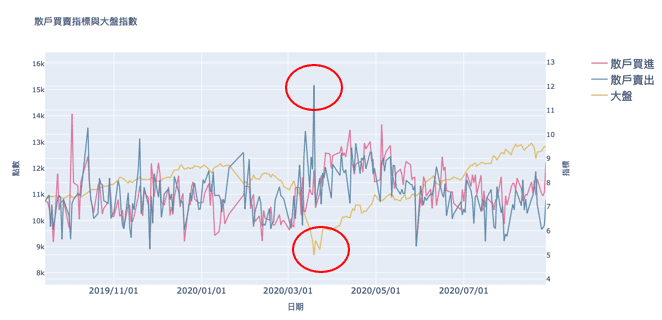 我們放大到疫情最恐慌的時候觀察,在3/19台股創下了近幾年的新低,收盤收在8681點,而散戶賣出指標也創下波段的新高,之後股市開始回穩,並一路向上攀升。