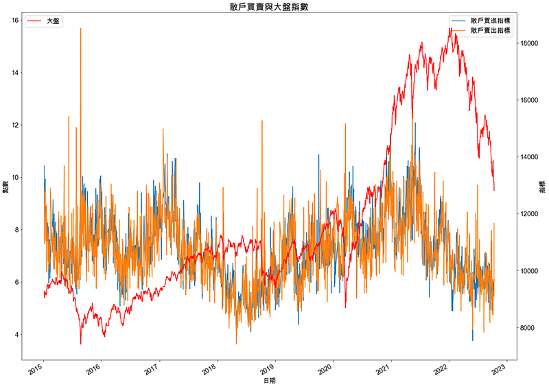 plt.title('散戶買賣與大盤指數', fontsize=20)