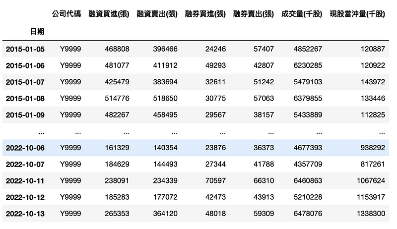 資料期間取2015/01/01到2022/10/13,分別取得了成交量、當沖量、融資買進、融資賣出、融券賣出、融券回補還有大盤指數的資料。