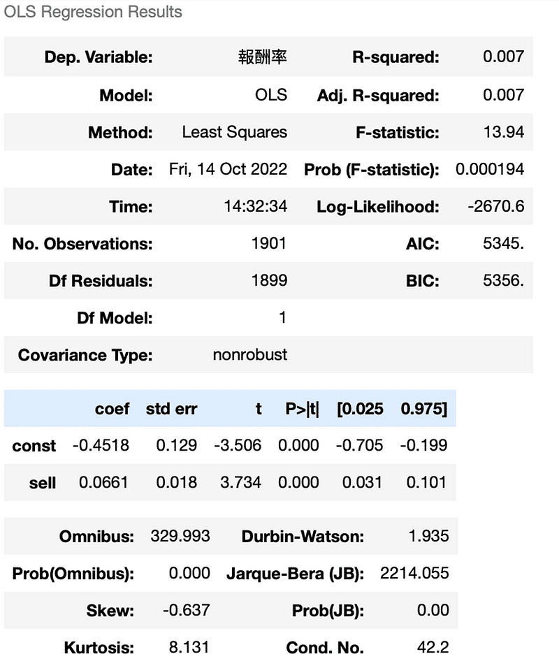 X = sm.add_constant(result['sell']) b = sm.OLS(result['報酬率'], X).fit() b.summary()